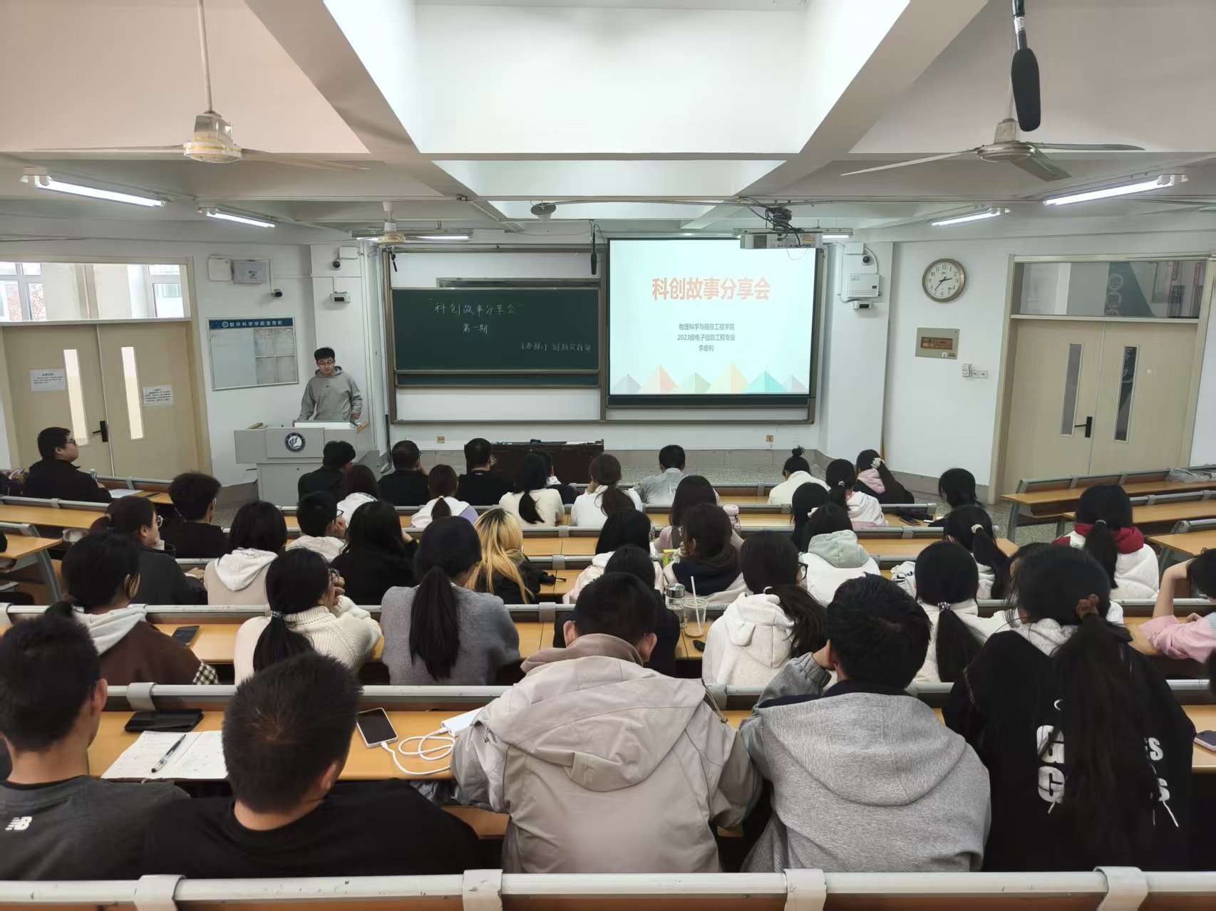本次活动分为科创介绍、经验分享和问题解答三个环节。活动伊始,主持人介绍开展科创故事会的目的,强调科技创新对大学生具有重要意义,号召同学们要积极参与有关科技创新的活动。随后,李宏利、房嘉辉、曹禄宇和张棋炜分别以自身丰富的科创竞赛经历为切入点,结合生动案例与详实数据,毫无保留地分享了在项目立意、选题构思以及团队组建等方面的宝贵经验。他们着重强调,参赛者务必精准把握各项赛事的核心特质,精心制定契合赛事要求的项目计划,更需在实施过程中展现出卓越的执行力,才能在科创竞赛中脱颖而出。互动环节,同学们踊跃举手发问,四位主讲人耐心解答,鼓励同学们要积极参与科技创新活动,将书本知识转化为实践成果,现场气氛浓厚热烈。