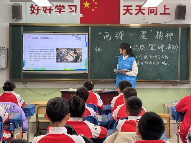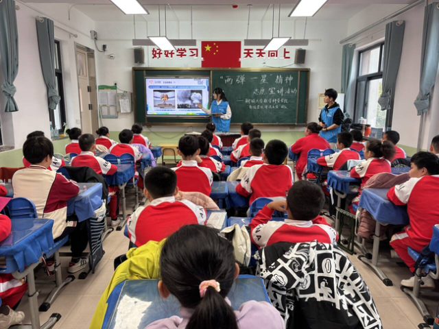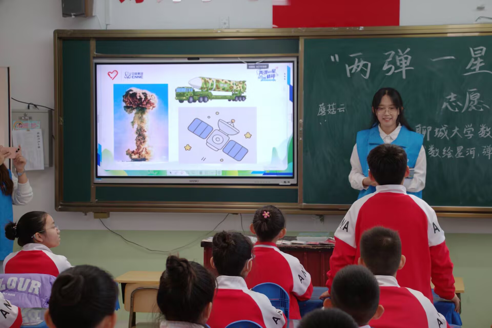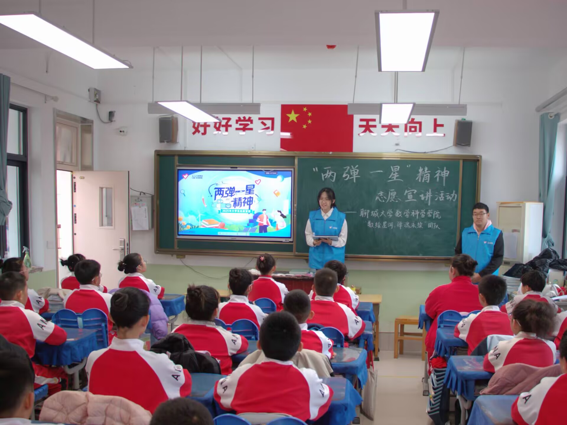 为引导青少年树立科技报国的远大志向,弘扬“热爱祖国、无私奉献、自力更生、艰苦奋斗、大力协同、勇于攀登”的“两弹一星”精神,11月6日,聊城大学“数绘星河,弹魂永续”志愿宣讲团于聊城大学附属小学开展“传承科学家精神,砥砺报国之志”暨“两弹一星”精神宣讲活动。