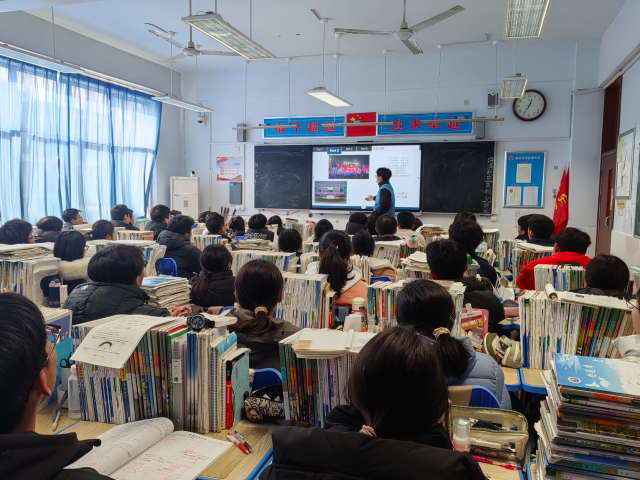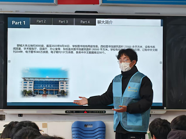 活动伊始,团队以精心制作的PPT展示聊城大学的校园风光、教学设施、特色专业以及丰富多彩的社团活动。一张张充满活力的照片,生动地展现着大学生活的多元与精彩,牢牢吸引住同学们的目光。成员们分享自己在大学的学习经历与生活点滴,从如何适应大学的学习节奏,到参与社团活动的难忘故事,用生动的语言和真实的经历,让同学们感受到大学生活的丰富多彩和无限可能。在互动环节,同学们热情高涨,围绕高考备考、专业选择、大学生活适应等方面积极提问,团队成员们耐心细致地解答,分享自己在高考备考中的独家经验和心得,鼓励他们保持积极的心态,合理规划学习时间,努力提升综合素质。