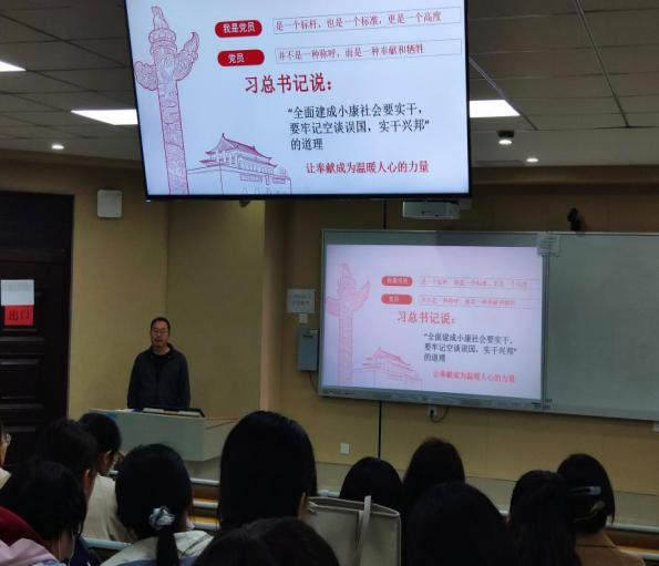刘玉堂首先强调奉献精神的重要性。习近平总书记说“全面建成小康社会要实干,要牢记空谈误国,实干兴邦”。党员是一个标杆,也是一面旗帜,更是一种高度,并不是一种称呼,而是一种奉献和牺牲。然后和同学们一起学习《中国共产党章程》总纲中提到的党的建设必须坚决实现的五项基本要求,详细阐述了全心全意为人民服务的内容,希望通过学习党章,使同学们更加深刻的理解为人民服务的内涵,进一步提高党员同学思想觉悟。