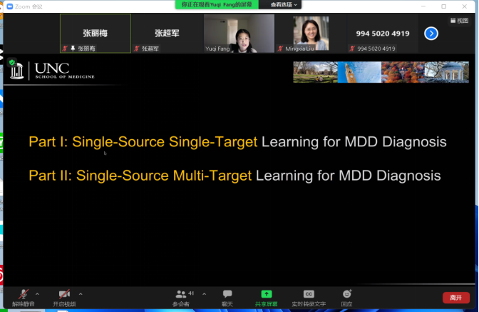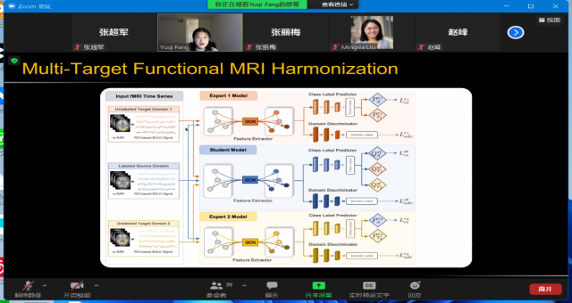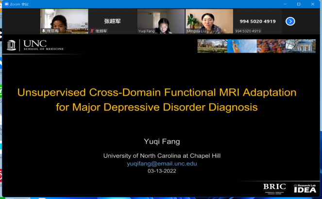 2022年3月13日(星期日)上午九点,受聊城大学智能数据分析团队邀请,北卡罗来纳大学教堂山分校房钰棋博士后在线上做了关于Unsupervised Cross-Domain Functional MRI Adaptation for Major Depressive Disorder Diagnosis 的学术报告,除智能数据分析团队的全部教师和研究生参加以外,本次会议也邀请了其他高校的老师和学生参加,在会议中师生们进行了精彩的发言讨论。
