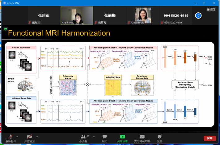 在本次会议中,房钰棋博士后首先介绍了她目前相关的工作内容,会议的主要内容介绍了静息态功能磁共振成像(rs-fMRI)数据的广泛应用,如脑功能障碍的自动化诊断,如重度抑郁症(MDD),可以用来协助干预。其中多部位fMRI数据被越来越多地用于增加样本量和提高MDD调查的统计能力。然而,现有的研究通常存在显著的站点间异质性,例如扫描仪和/或扫描协议的差异。为了解决这个问题,房钰棋博士引入了两个用于自动MDD识别的无监督跨域fMRI适应模型。