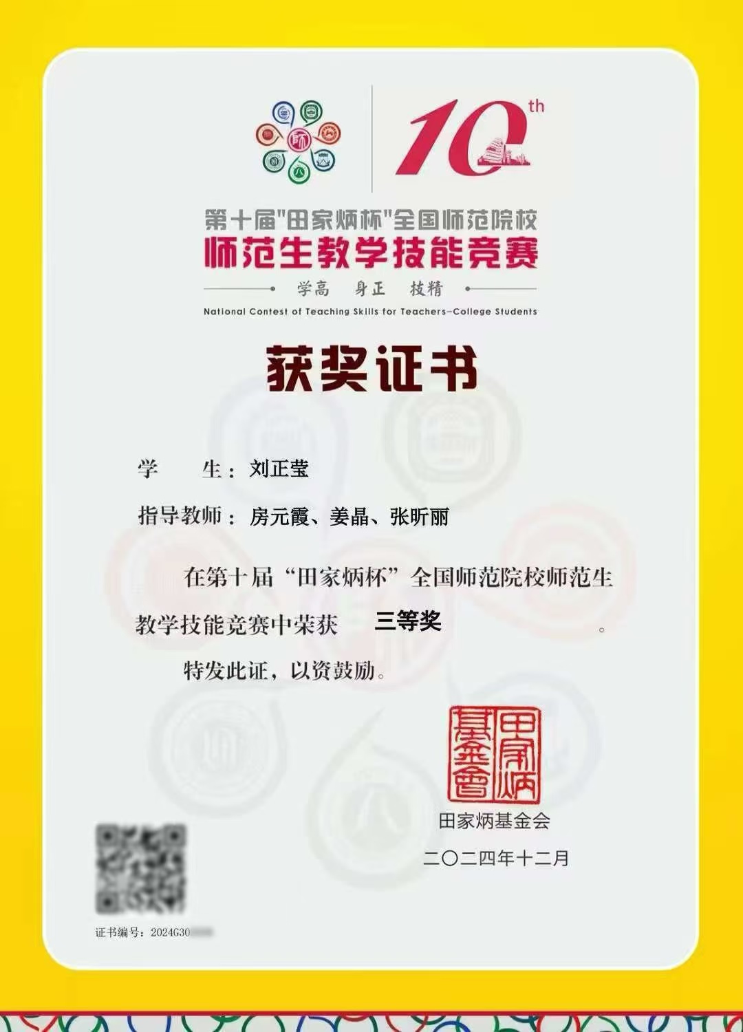 三、28预测(中国)官方网站 刘正莹在第十届“田家炳杯”全国师范院校师范生教学技能竞赛中荣获全国三等奖