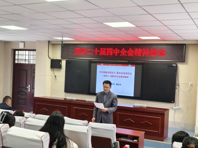 为深刻领会、准确把握党的二十届四中全会精神的丰富内涵与核心要义,引导全院教职员工将思想和行动统一到党中央的决策部署上来,11月6日,28预测 党委特邀政治与公共管理28预测 秦正为教授,为28预测 全体教职工做了一场精彩而深刻的专题宣讲报告。报告会由28预测 党委副书记、副院长张进军主持,28预测 全体教职工参加学习。