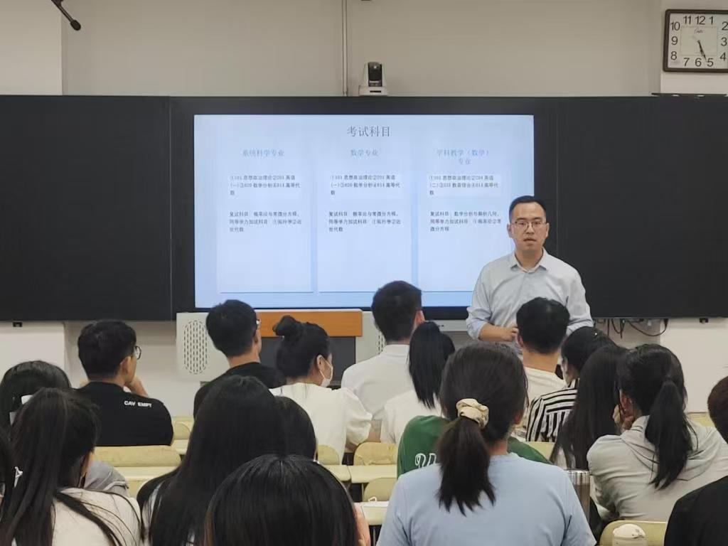 陈国梁从考研形势、院校选择、考研技巧等环节详细展开讲解,他强调了数学专业在学术和应用领域日益增长的需求,让学生对考研大环境有更清晰的认识,为学生点明读研深造的重要意义。他向学生们介绍了不同院校相关专业研究生教育的基本情况、招生特点、后续发展趋势等信息,通过具体的图表数据对比,客观分析了当前一些高校的研究生录取现状,为在座学生提供了清晰明确的报考思路。随后,陈国梁结合自身经验,分享如何合理安排时间以及如何制定长期、短期计划等一系列提高复习效率的方法,并对学生们提出的考研相关问题进行了耐心详细的解答,鼓励在场同学积极报考聊城大学。